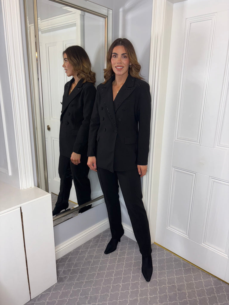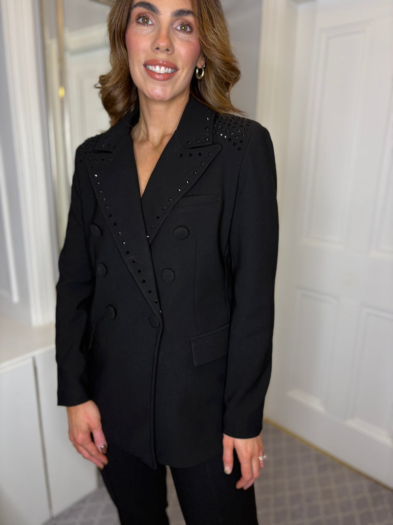 The Valeria Jacket combines edgy style with comfortable wearability. Crafted from a durable polyester and spandex blend, it offers a slight stretch for ease of movement. Featuring an all-black design accented with matching black studs, this jacket delivers a sophisticated yet bold statement. Fully lined in polyester, it ensures a smooth fit and lasting comfort, making it an ideal choice for elevated casual or nightlife looks.