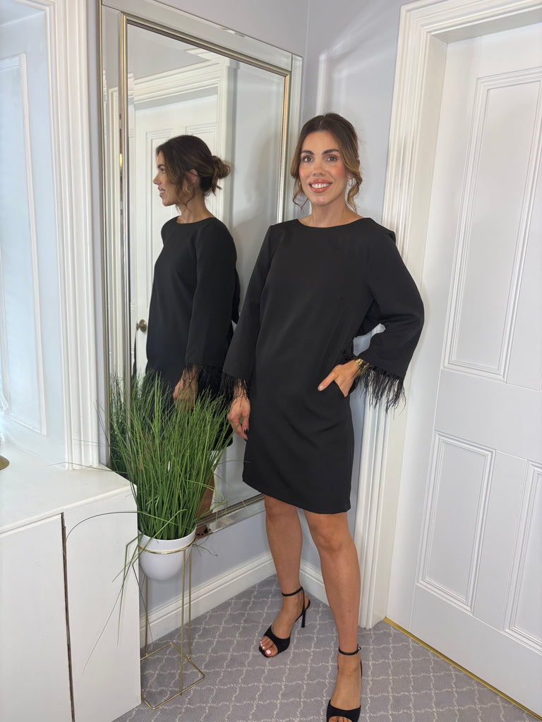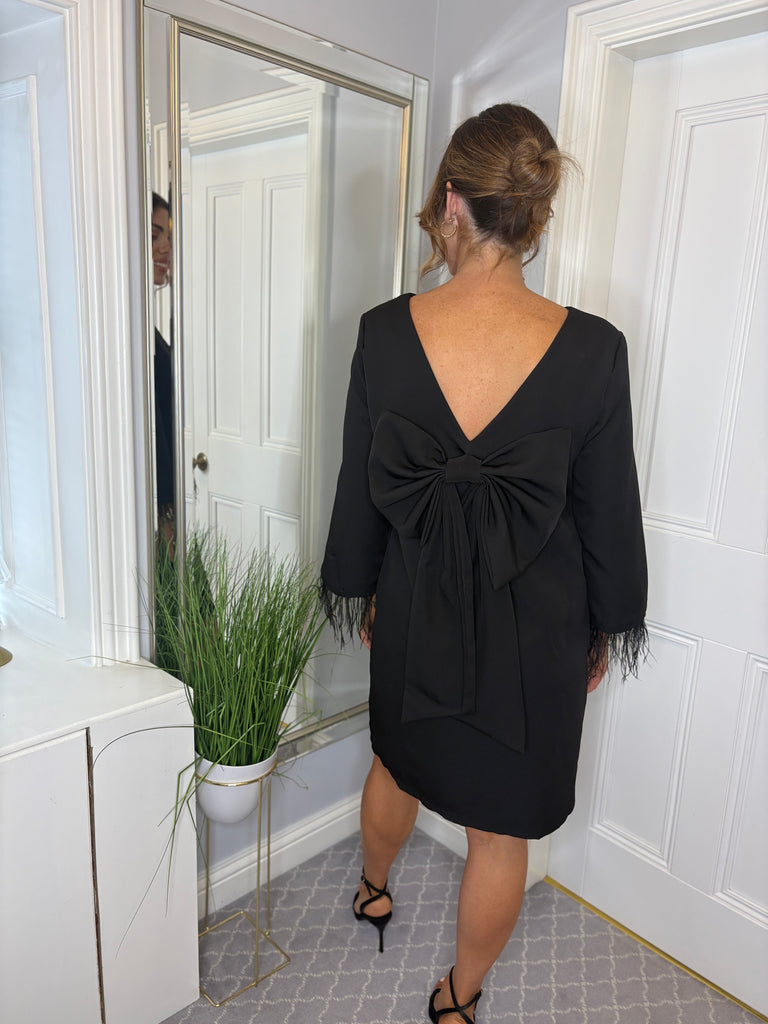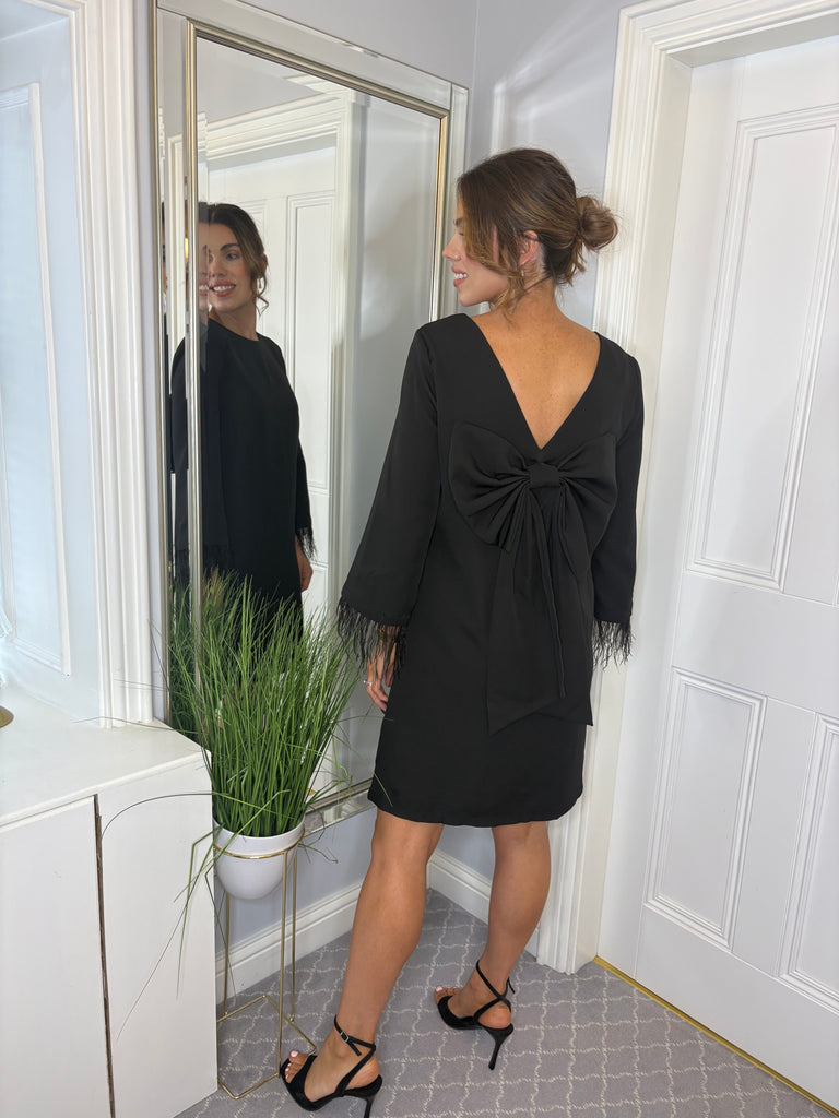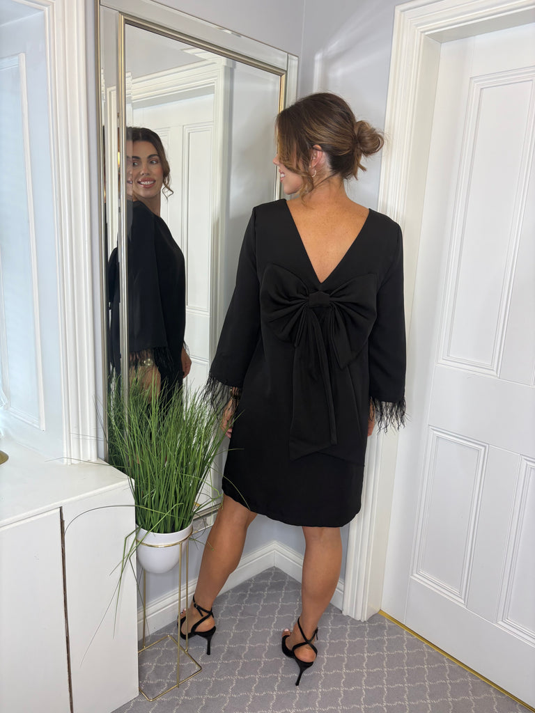 The Bogha Dress in black offers an elegant shift silhouette with a flattering V-back design. Skillfully crafted with a delicate bow detail and unique fringe sleeves, it combines sophistication with subtle movement. Designed to be bra-friendly, this dress ensures both comfort and style, making it a versatile choice for refined occasions.