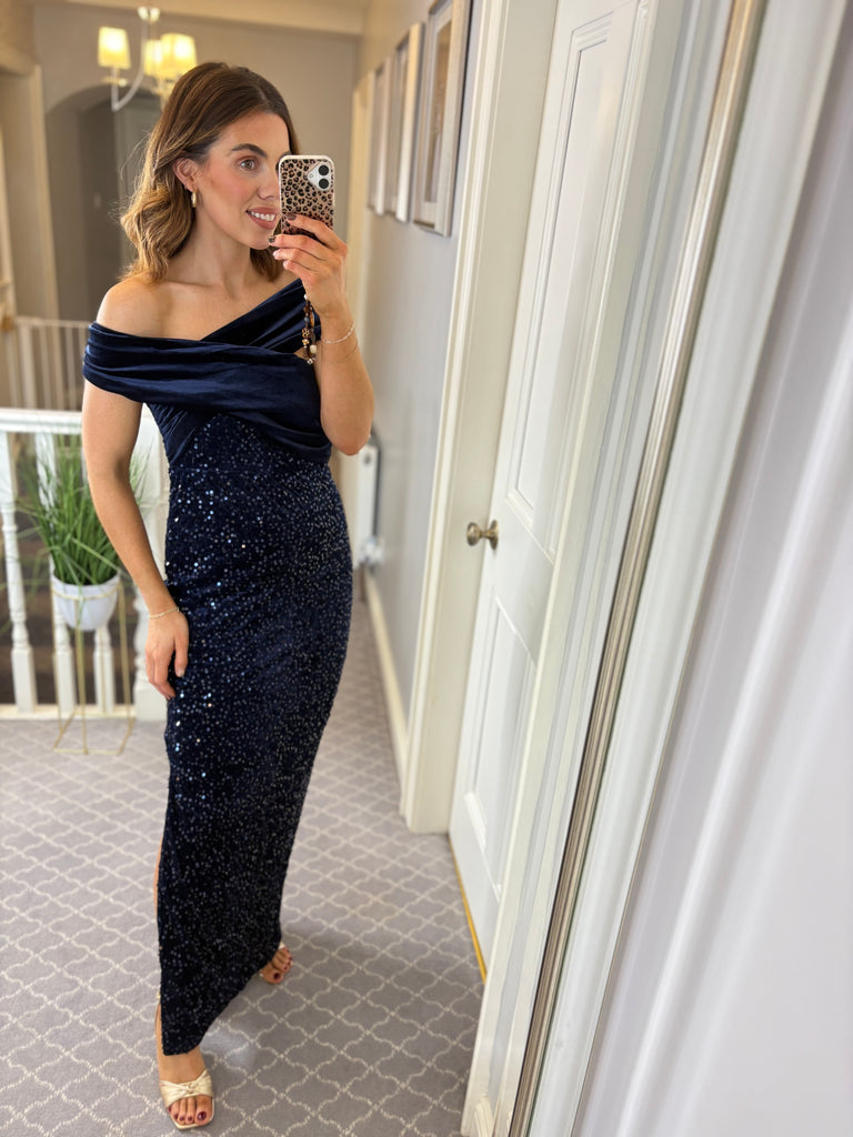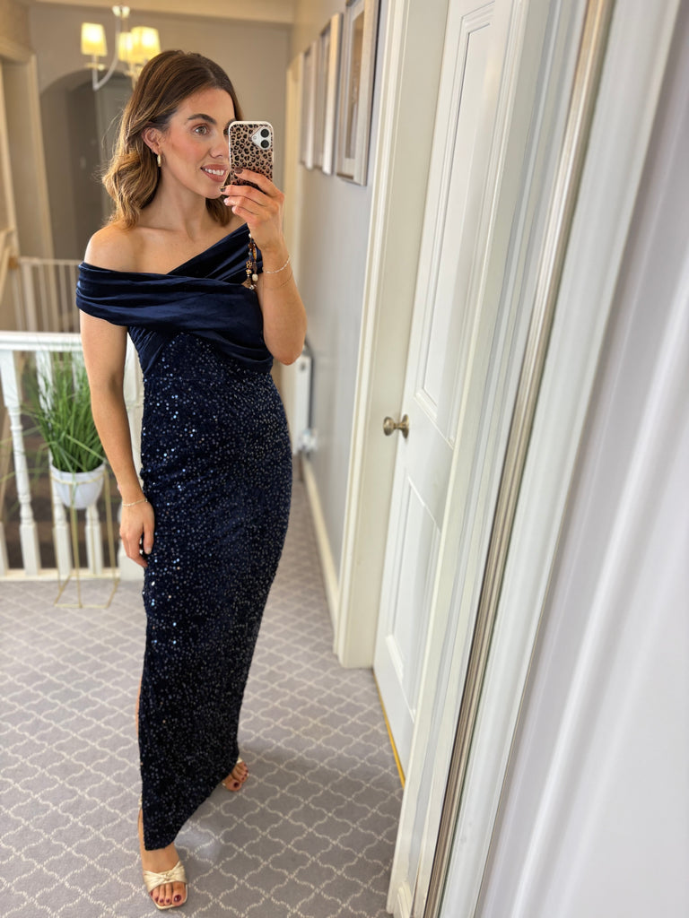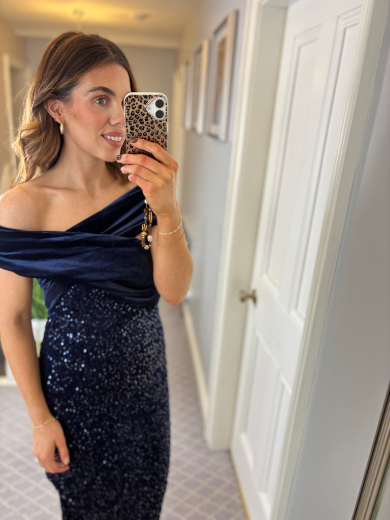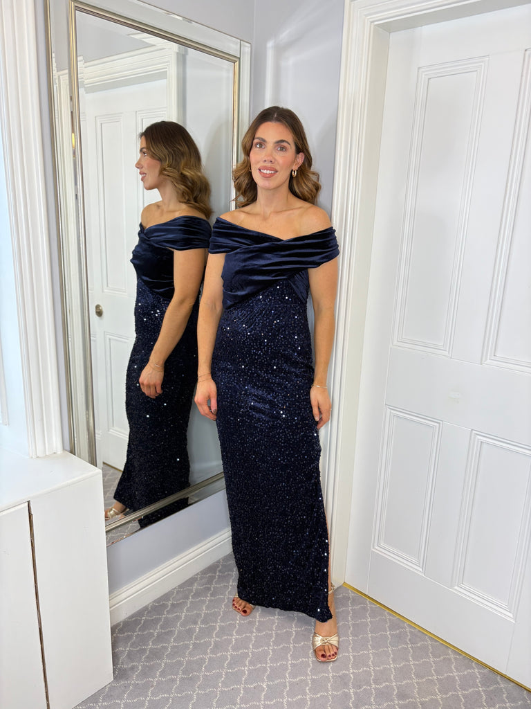 This navy sequin dress features a sophisticated velvet asymmetric shoulder, combining shimmer with rich texture for a striking look. The fitted silhouette enhances elegance, making it perfect for formal occasions or evening events. The contrast of sequins and velvet adds depth and refinement, ensuring you stand out with timeless style.