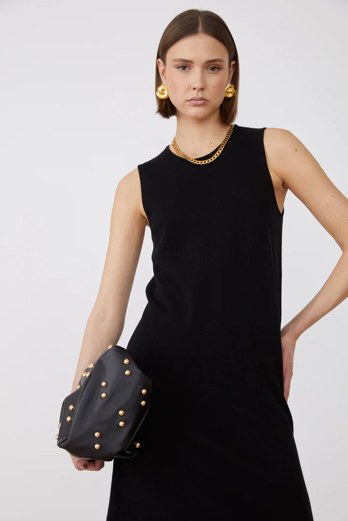 The Sheila Knitted Dress in taupe or black offers a refined silhouette with its sleeveless cut and elegant round neckline. Side slits provide subtle movement and a modern edge, making this dress an exquisite choice for a polished, sophisticated look.